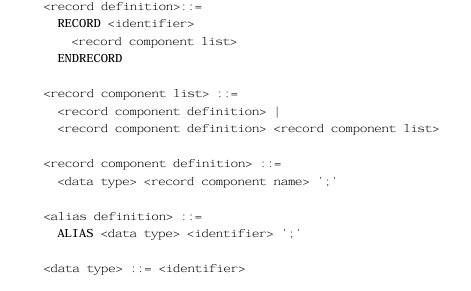 • 记录数据类型就是含多个有名称的有序部分的复合类型,如pos。其中任意部分 可能由基本类型构成,也可能由记录类型构成。 可用聚合表示法表示记录数值,如[300,500,depth]pos记录聚合值。 通过某部分的名称可访问数据类型的对应部分,如pos1.x:=300;pos1的x部分 赋值。